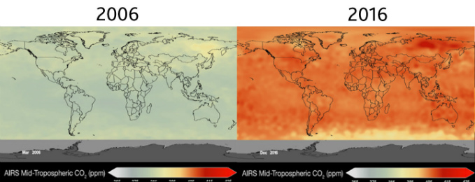 The image we see is devastating. It shows the change in the concentration of carbon dioxide produced in the troposphere between 2006 and 2016, and the radical change from the colour ochre to red shows us the very high and dangerous levels we are living with.