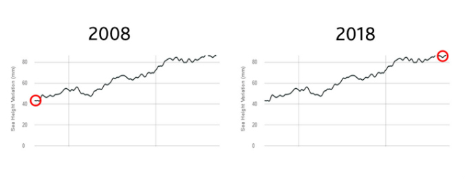 Associated with the shrinking of the glaciers is a deluge of problems, the most obvious of which is the rising sea level. In the graphs below, we can see how the sea level has not only continued to rise over the last decade, but that it is increasing exponentially. The average sea level variation in the global mean is 3.1 (± 0.3 mm) per year, with an annual acceleration of 0.1 mm over a 25-year period.