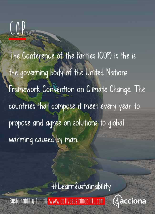 The Conference of the Parties, commonly abbreviated as COP, is the body of the United Nations Framework Convention on Climate Change (@UNFCCC) which aims to "guide the efforts of the countries that are parties of the Convention to act against climate change", ie, prevent human interference in increasing the average temperature of the Earth.