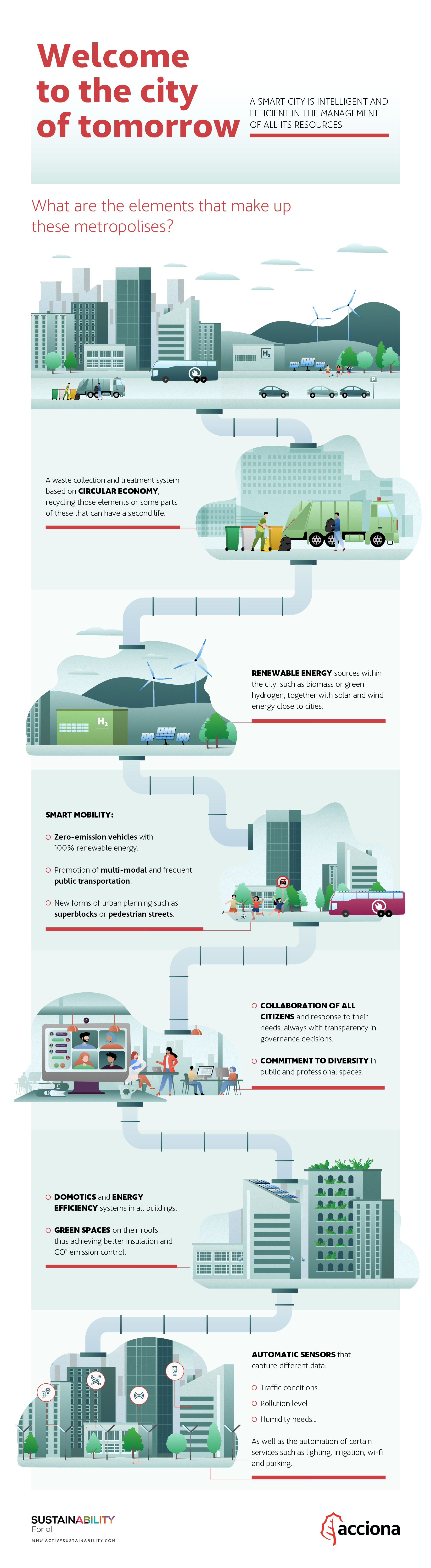 Therefore, the city of the future must make life easier for its residents and promote change in how urban spaces are organised and managed. See the following infographic for several ideas we've come up with: