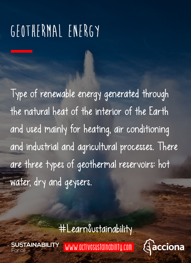 Within the range of renewable energies, geothermal energy is that generated through the natural heat of the interior of the Earth. There are three types of geothermal reservoirs: hot water, dry and geysers.