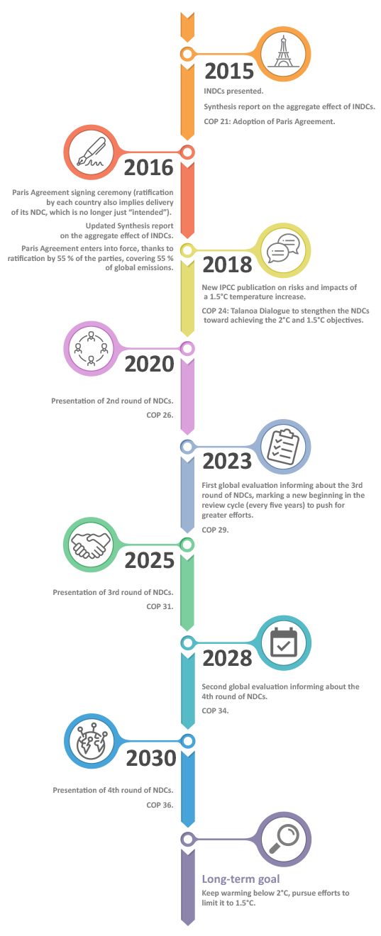 At the heart of this accord were the INDCs (Intended Nationally Determined Contributions), the fundamental mechanism by which each country would bring to the table the national efforts it planned to take as of 2020 to fulfil the most ambitious objectives in the Agreement: keep the increase in global temperature to well below 2°C with respect to the pre-industrial era, with the further aim of limiting it to 1.5°C; and strengthen the capacity of adaptation to the adverse effects of climate change and increase resilience.