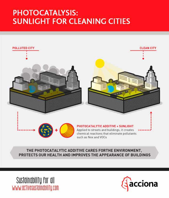 Photocatalysis is a photochemical reaction that converts solar energy into chemical energy on the surface of a catalyst or substrate consisting of a semiconductor material that accelerates the speed of the reaction. During the process, both oxidation and reduction reactions take place. In this way, most of the pollutants in cities can be eliminated.