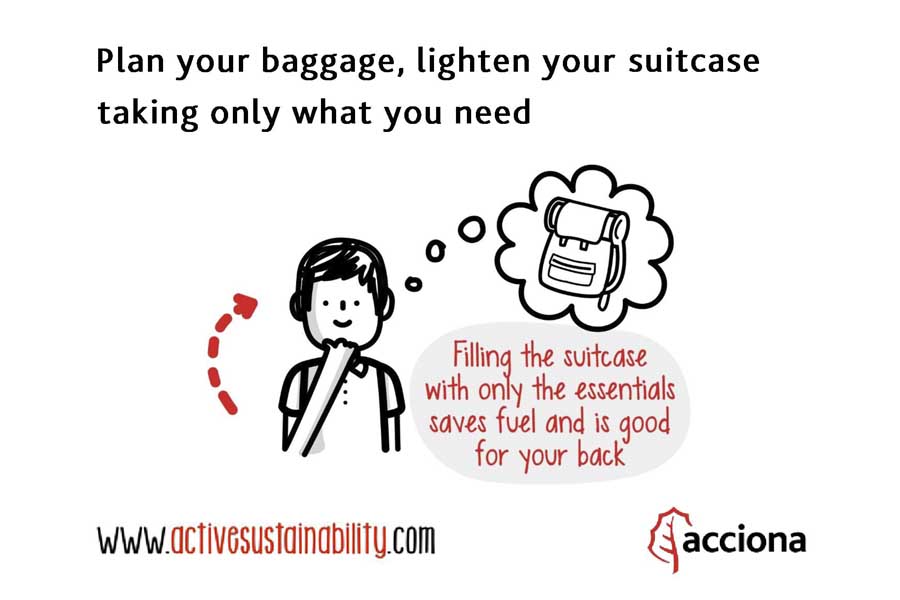 When you spend several days away from home you need to plan how many clothes you need. There’s no point in taking fifteen clothes for a week-long trip. This way, we will not have to wash all our clothes again. A suitcase loaded with only the essential means fuel-saving... and less harm for our back.
