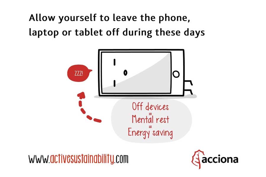 Mobile phones, computers or tablets have us enslaved most part of the year. When we finally go on vacation we are supposed to take a break from work. It will not be a total break unless we disconnect completely from e-mails, reports and meeting dates. Turned off devices = mental break = energy saving.